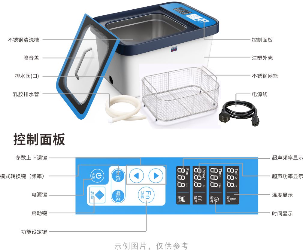 (2)對于一臺未開啟加熱功能的超聲波清洗器來說,持續(xù)工作1~2小時后,它的水溫會因換能器本身發(fā)熱而使清洗溶液溫度上升至50℃左右。當(dāng)您的應(yīng)用可能需要一個準(zhǔn)確的、穩(wěn)定的溶液溫度時,請考慮上述因素。此系列儀器目前不具備制冷控溫功能。當(dāng)超聲、加熱同時開啟,持續(xù)工作將導(dǎo)致溶液溫度超過您設(shè)定的加熱溫度,即使加熱器因達(dá)到儀器的設(shè)定溫度而停止運行,但由于超聲的啟動,溫度也會上升。如果發(fā)生這種情況,請暫時關(guān)閉清洗器,讓溶液冷卻下來。